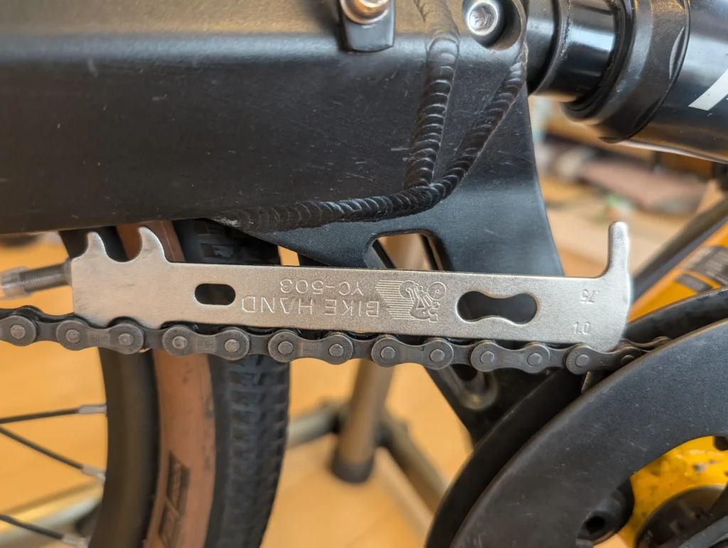 チェーンはプーリーを外すことでチェーンを切らずに再利用できますが、念の為にチェーンチェッカーで測定。